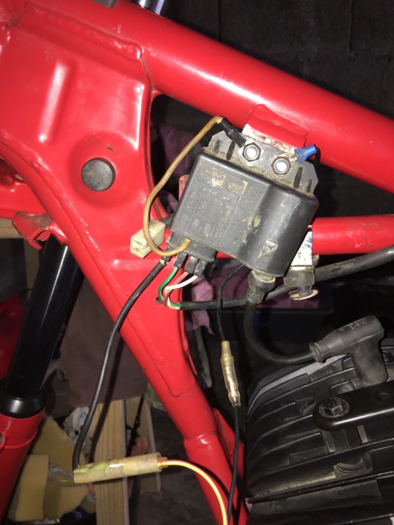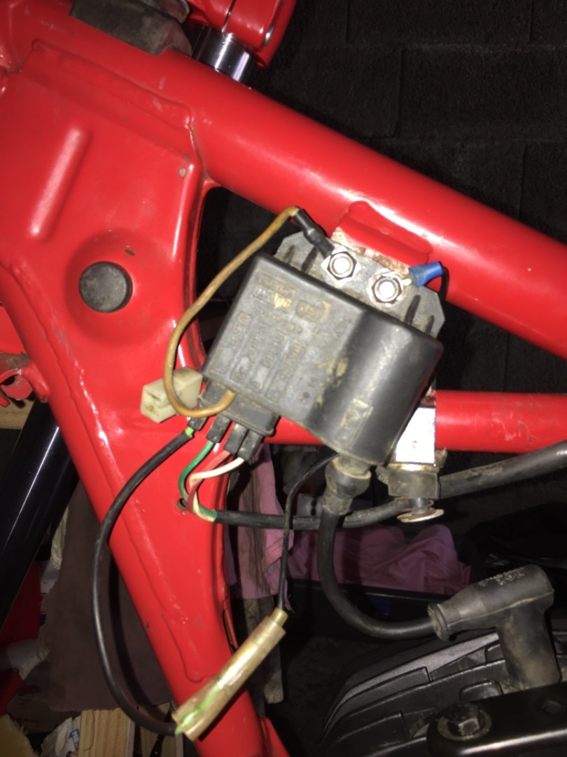 Le fil qui ressort de ce bouton ou interrupteur, tu repars à ta bobine, et tu le branche, en soudant au bout de ce fil, une cosse ronde, qui sera prise sur la prise masse de ta bobine, celui  du  fil jaune bobine et sa cosse, qui vient se serrer sur un des 2 boulons..qui maintiennent la bobine