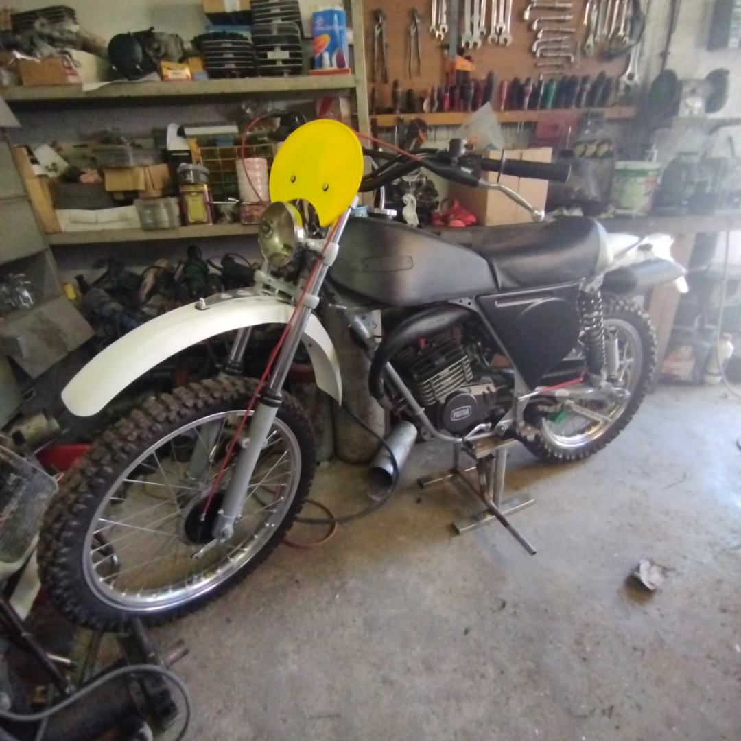 J'ai acheté ma FANTIC CABALLERO en 93, tout juste roulante. Elle avait un réservoir en acier vert gazon, une selle carré avec le fond en contre-plaqué , mousse et revêtement en skaï marron du canapé de la grand-mère, avec 5 vitesses et l'embrayage qui reste collé sur les 100 premiers mètre, une plaque de visite ROCVALE, un compact système en 12 avec une pipe et carburateur de 19 (donc démarre après 20 mètres de poussette), une fourche et roue avant de ????, l'arrière du cadre plier pour relevé le garde boue, les plaques latérales maison, etc... et je vous en passe. Une vrai Frankenstein.