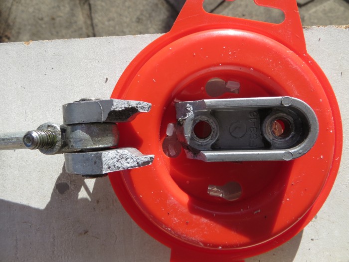 Cette pièce qui tient le levier d’embrayage sur le moteur, dégage en général lorsque la chaîne saute. Il faut croire qu’elle a dû en prendre un (ou plusieurs) coup dans le passé.