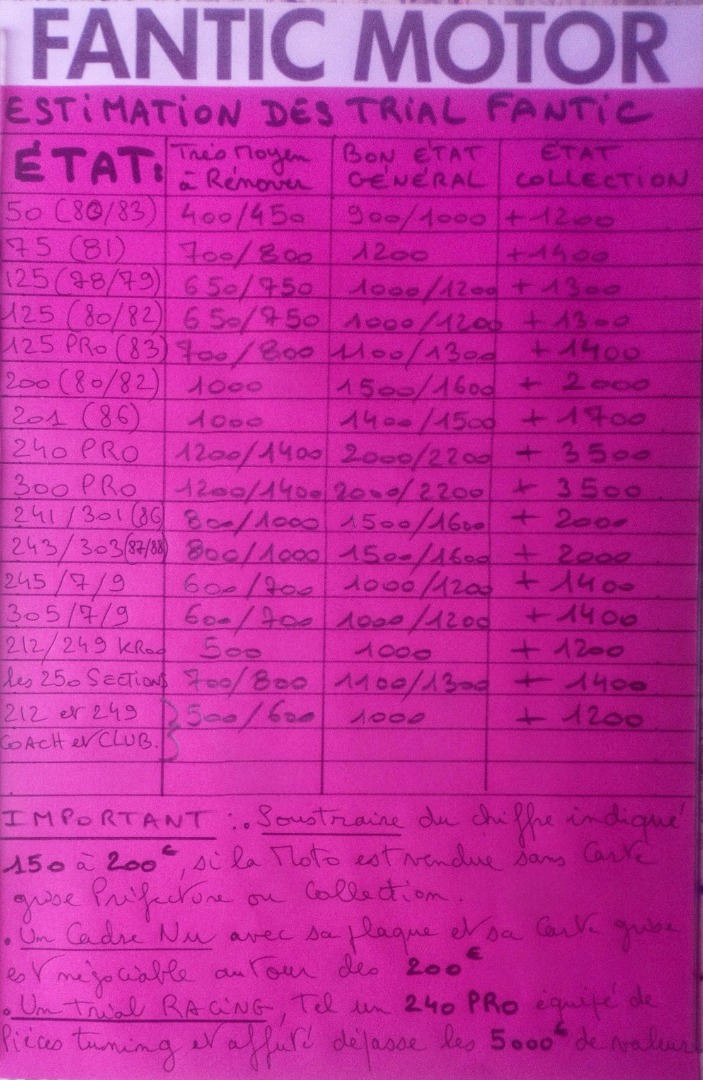 Donc je remet le même feuillet ici même, afin que chacun du forum ou des visiteurs, désirant acquérir un modèle trial Fantic...puissent avoir une idée générale, de la valeur d'un modèle ...selon son état .