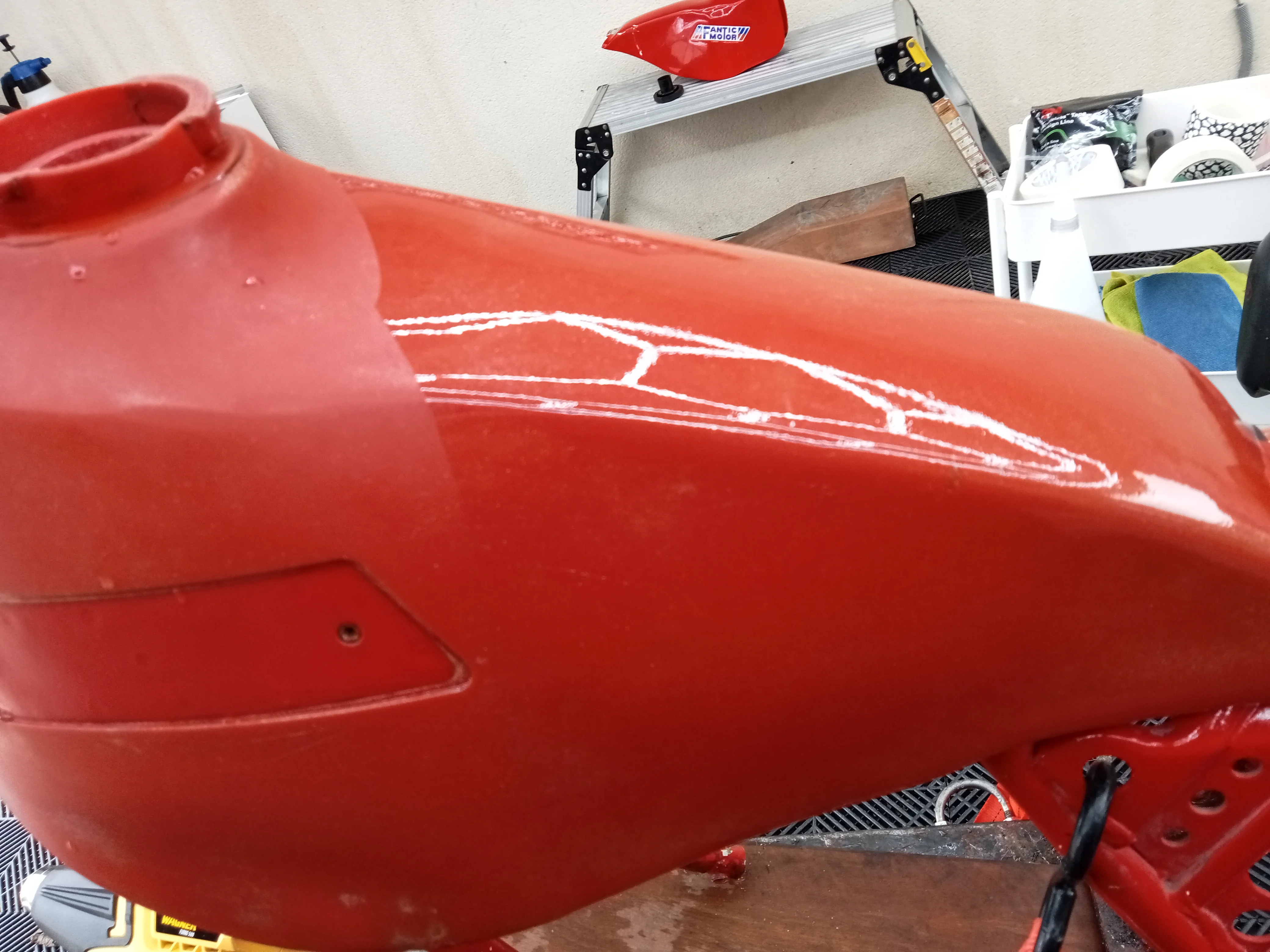 2 ème test toujour sur une moitié , l'idée c'est de sauver mon réservoir sans refaire de peinture, je fais les tests avec un ptf transparent et si c'est concluant je ferai mes réservoirs en ptf rouge bien sûr. actuellement ça fait 2 jour que je l'ai posé pour l'instant ça tient , on verra au bout d'une semaine et si ça tient toujours alors ce sera presque indestructible avec la possibilité de l'enlever si on veut changer de couleur 😉​ on ne sais jamais.1000016196.webp