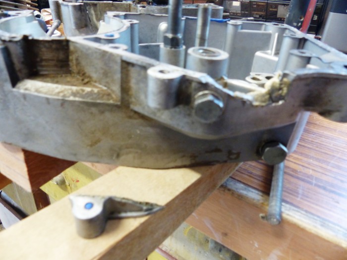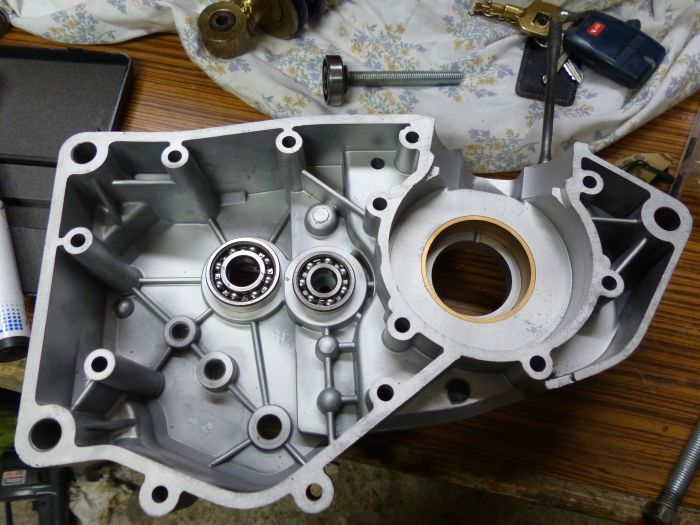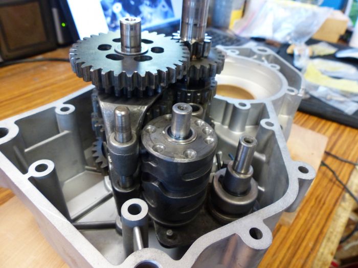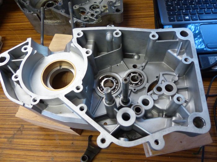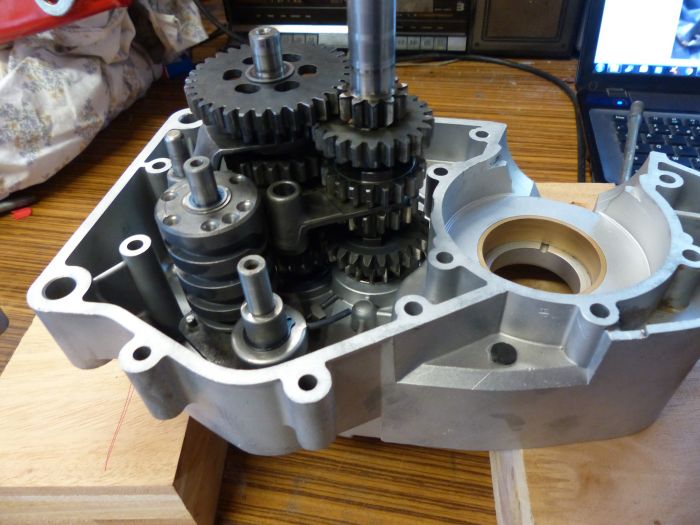 Suite de la resto du TX 150, microbillage des carters mis en place des roulements, pignons de boîte, barillet et axe du sélecteur; il me manque une rondelle de jeu pour le barillet et les pièces interne de l'axe du kick pour fermer le moulin.