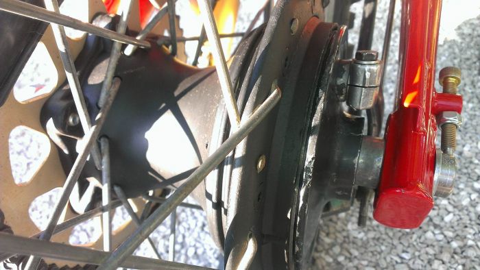 Je cherche une roue arrière (ou le moyeu), son axe et une flasque de frein comme ci-dessous :